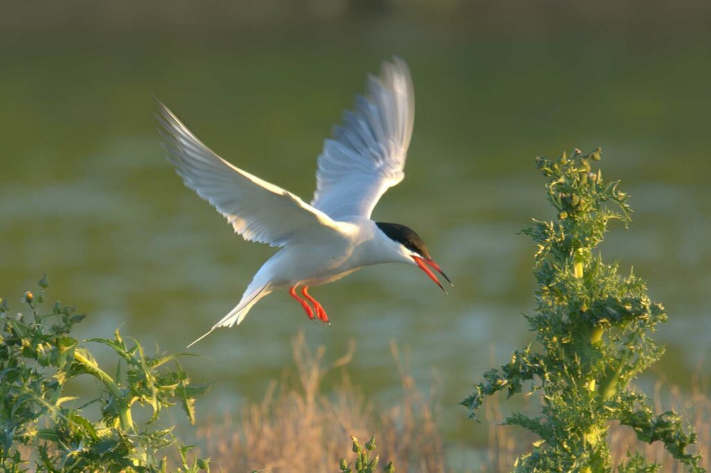 Une sterne pierregarin rentre au nid, éclairée par la lumière du soir