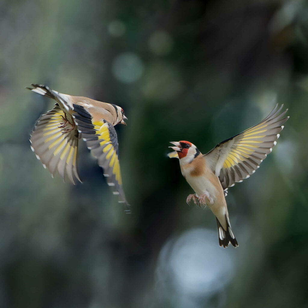 Chardonnerets élégants, deux mâles discutent. Ils appartiennent à une troupe d'une quinzaine d'oiseaux. Que se disent-ils ?