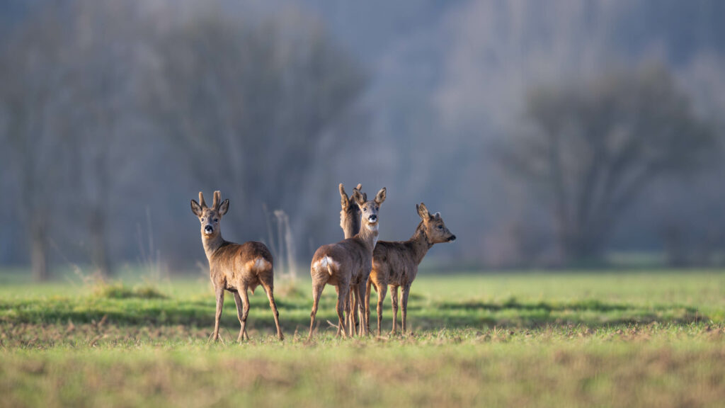 Petite harde de chevreuils aux aguets photographiée dans une petite prairie