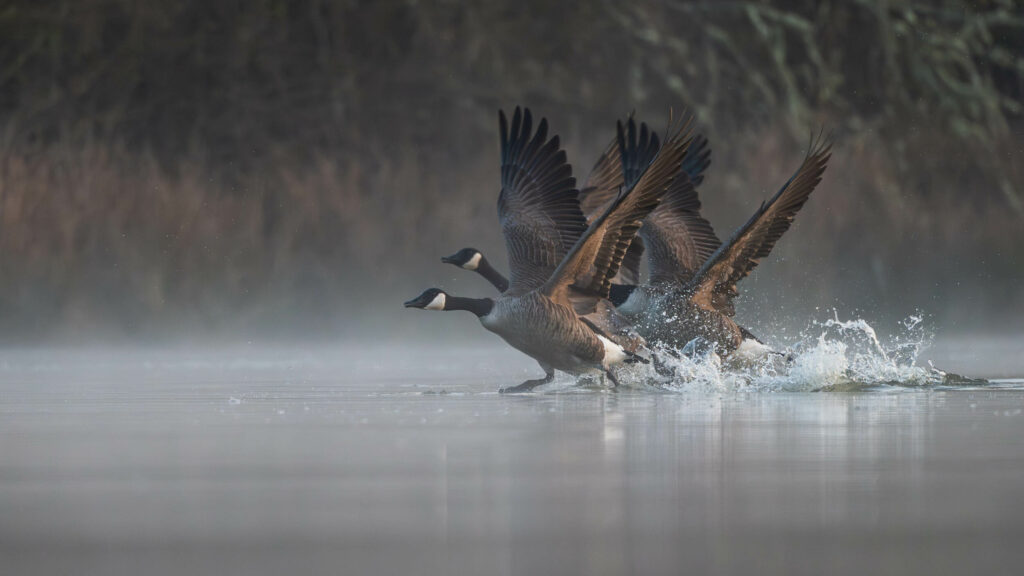 Bernache du Canada décollant d'un étang Solognot au lever du jour.