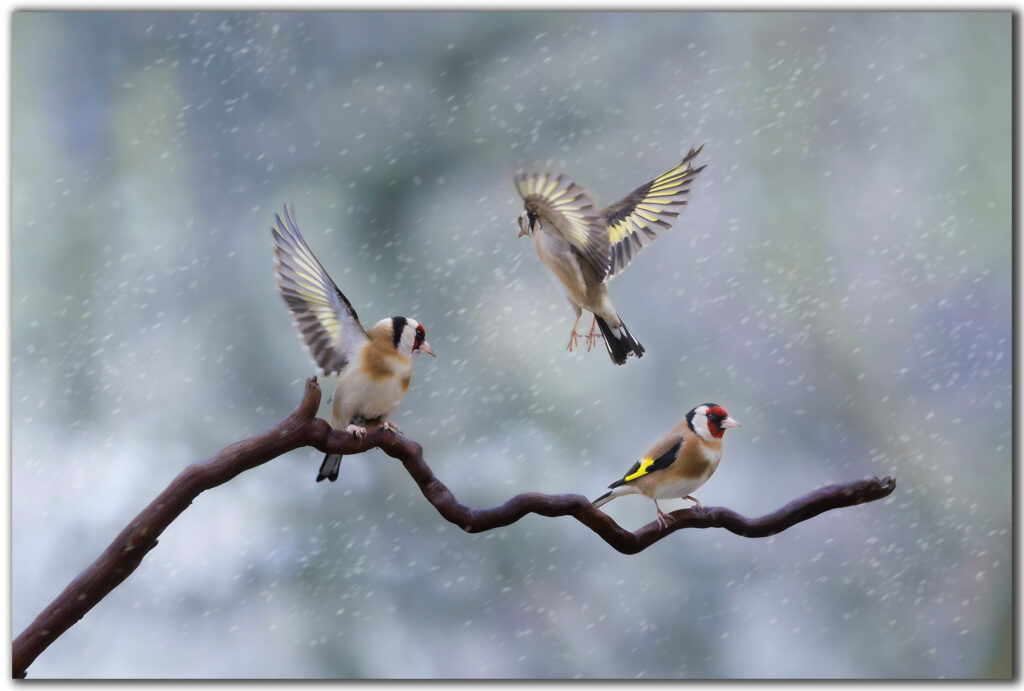 Une photo magnifique et très artistique. Tout y est : la compo avec cette branche tordu , l’arrière plan lumineux avec des tons pastels et les 3 chardonnerets dans des positions différentes (l’un statique, l’autre prêt à décoller et le dernier en suspension dans les airs). Cela donne un mélange de dynamique et de douceur avec un rendu de couleur très naturel. 2L++