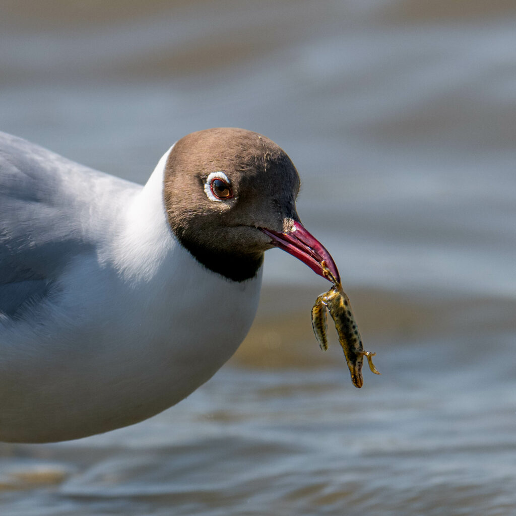Mouette avec sa prise, un triton palmé qu'elle vient de pêcher dans un petit étang sur le bord du littoral