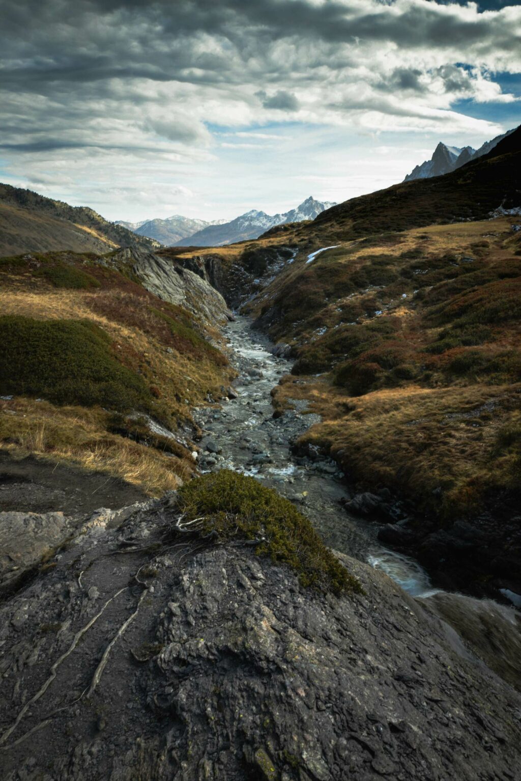 Image percutante pour moi , sombre et lumineuse à la fois ! On a du mal à cerner les proportions et l’endroit , cela pourrait être ici dans le Mercantour comme ailleurs très loin ! Les couleurs d’automne avec cette lumière rasante et ce jeu d’ombre et de lumière contribue au mystère de cette image. La compo n’est pas en reste et ce gros rocher en premier plan un peu sinistre ajoute à la rudesse de ce paysage sauvage de montagne qui nous fait rêver! l Le torrent nous conduit vers ces pics enneigés ! Le ciel avec ces nuages referme bien l’image. Beau travail pour moi ! 2L