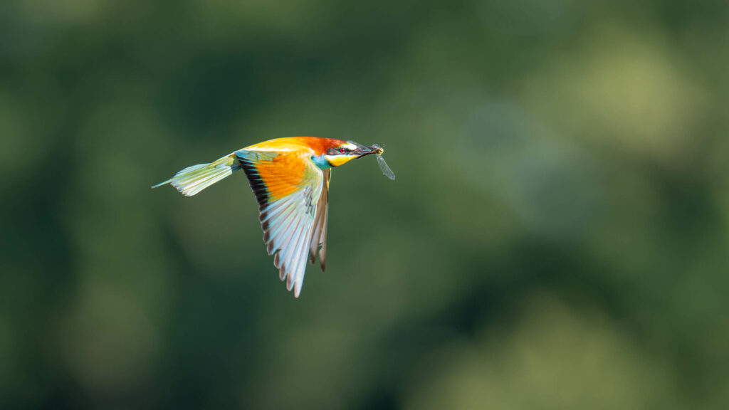 Guêpier d'Europe de retour de chasse avec sa prise dans le bec