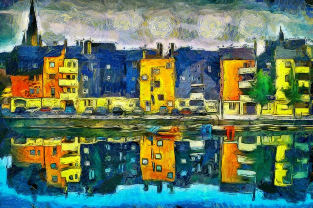 un cliché que j'avais pris il y a quelques années qui fait comme une peinture mais qui n'est en réalité qu'un reflet pris dans le canal de l'Ourcq à Paris (j'ai juste joué avec les contrastes et couleurs).
