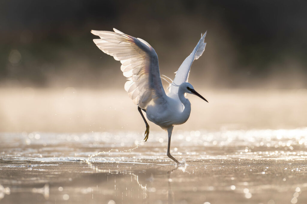 Qu’elle est gracieuse cette aigrette ! Une scène dynamique très bien captée et bien maîtrisée techniquement: composition, belle gestion de la lumière. J’aime beaucoup l’harmonie des couleurs, la transparence des ailes, la réflexion brillante de l’eau et ce fond très fondu qui permet de bien valoriser l’oiseau.