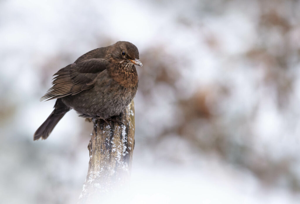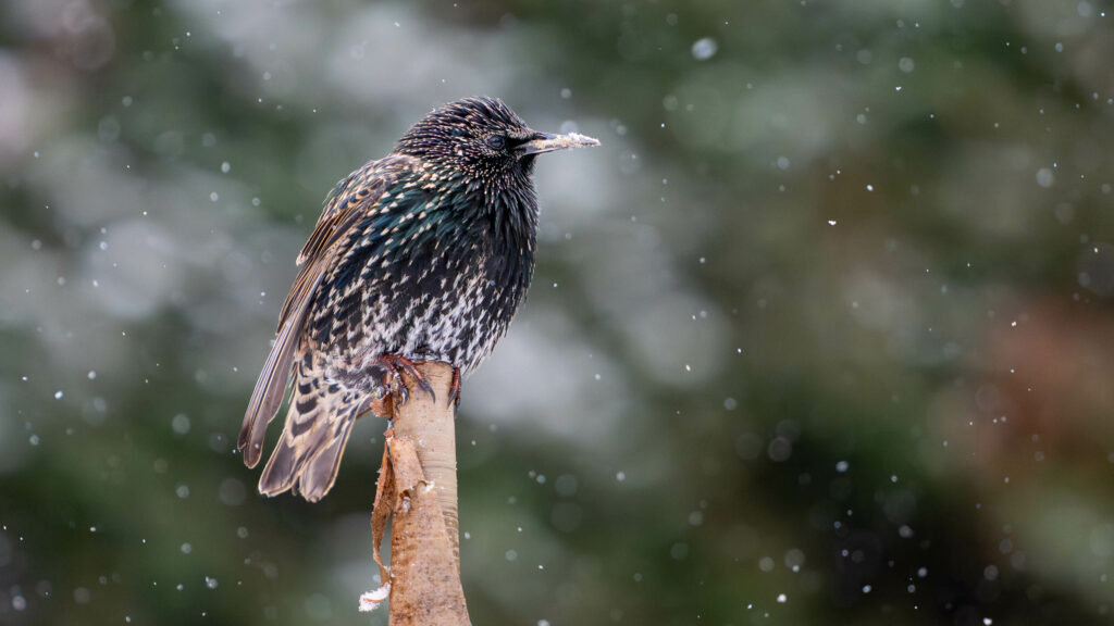 Etourneau Sansonnet photographié dans mon jardin sous une averse de neige