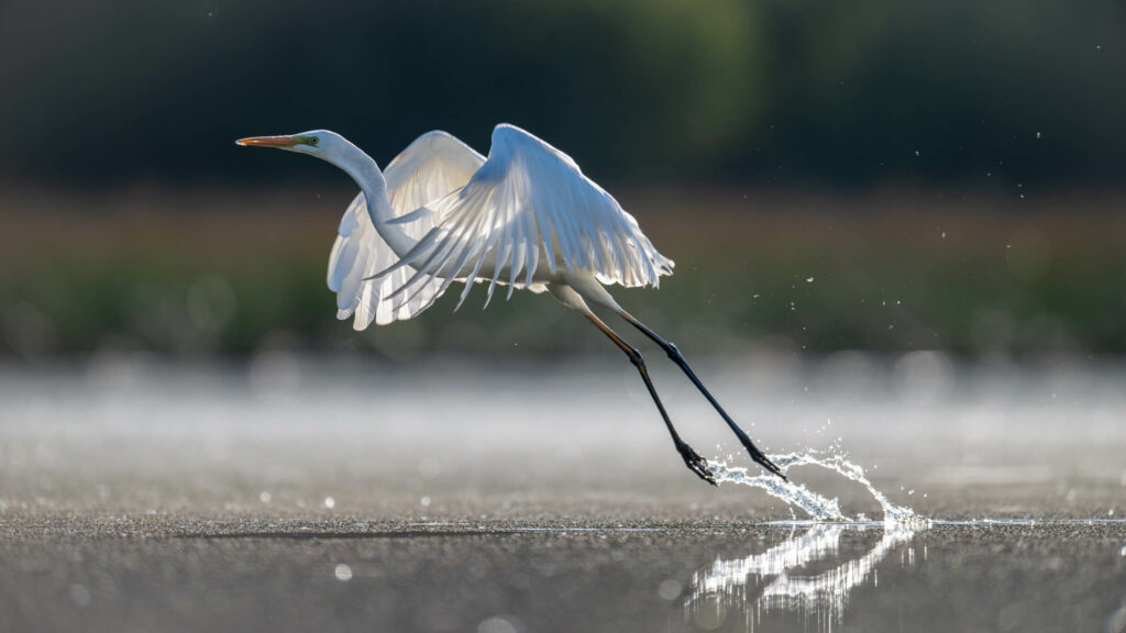 Grande aigrette photographiée décollant d'un petit étang au lever du jour