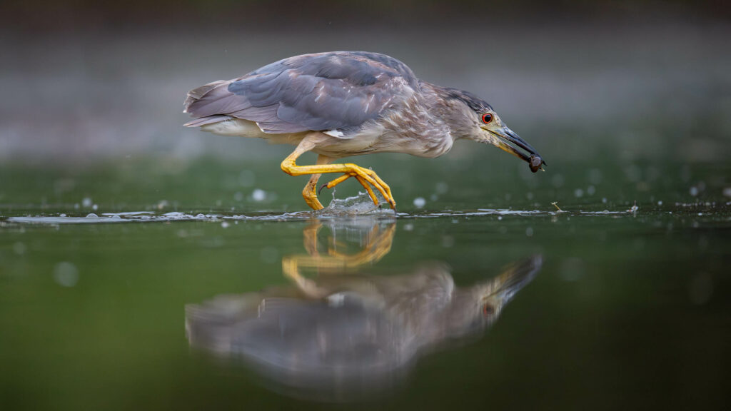 Héron Bihoreau juvénile en action de pêche sur la queue d'un petit étang Solognot.
