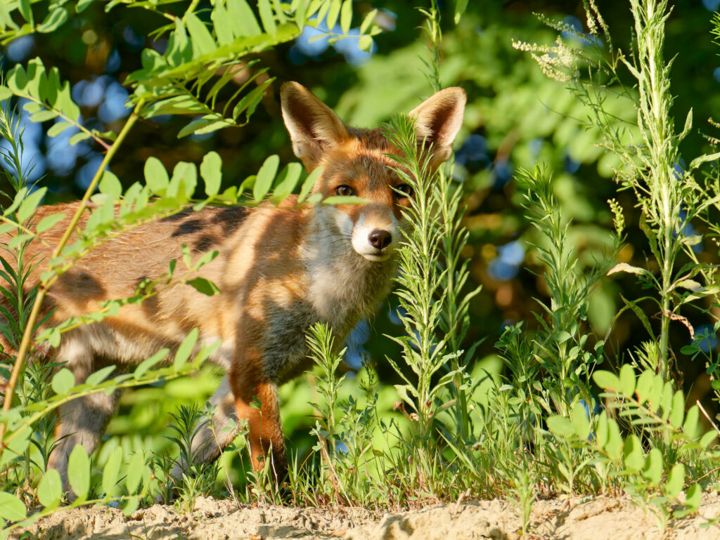 Installé dans le bas d’une butte pour fixer des guêpiers, je perçois un mouvement sur ma droite, je me tourne d’un quart de tour, je découvre une jeune renarde qui me regarde et l’instantané est dans la boîte.( photo non recadrée)