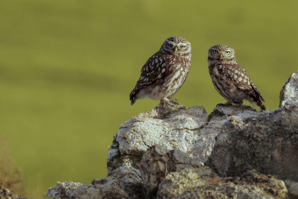 Ce couple de chevêche d’Athéna, vit dans cet endroit, aucun appât ne leur est donné. Le mâle devrait être le plus petit, et il lui manque une patte.