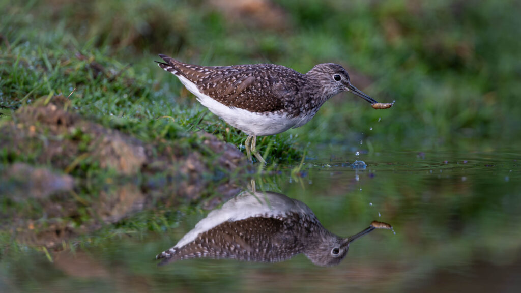 Chevalier Cul-blanc extirpant de la vase une larve pour son petit déjeuner.