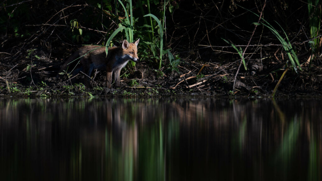 Renardeau photographié en fin de journée sur le bord d'un petit étang Solognot