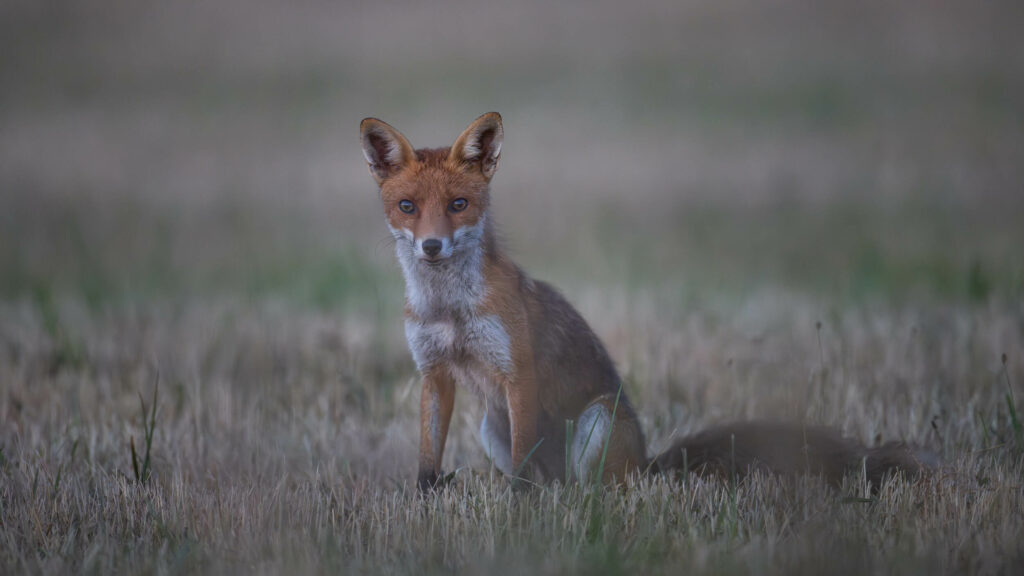 Il était un peu plus de 22H ce soir là je rentrait d'une séance d'affût flottant, je longeais un champ fraichement fauché quand j'aperçu ce renard muloté entre les bottes de foin, je me suis caché derrière l'une d'elle espérant qu'i vienne dans ma direction, ce qui arriva quelques minutes plus tard ou il posa puis s'allongea à moins de 8 mètres de moi