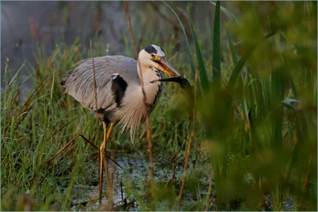après de longues minutes à le triturer et le retourner dans tous les sens, ce "chat" a fini par rendre l'âme dans le bec du héron.