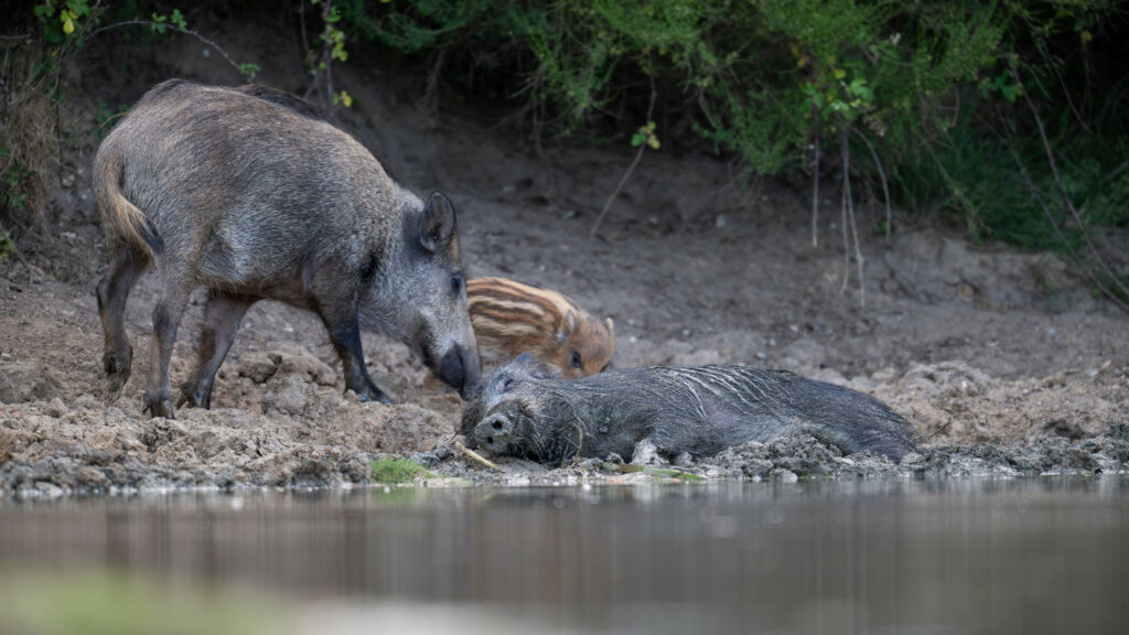 Sangliers se baugeant dans la boue en lisière d'étang.