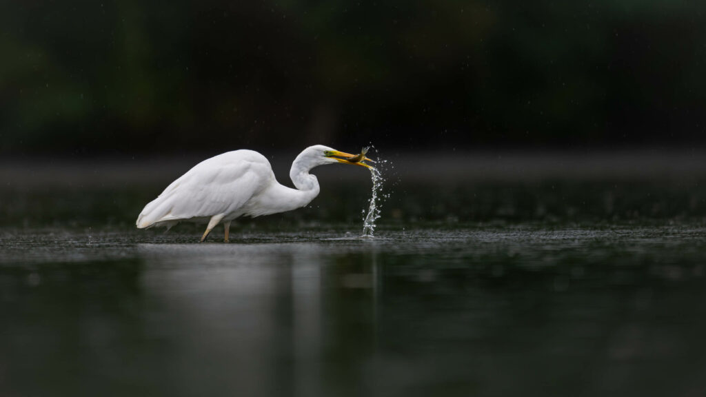 Grande aigrette photographiée un matin pluvieux en action de pêche.