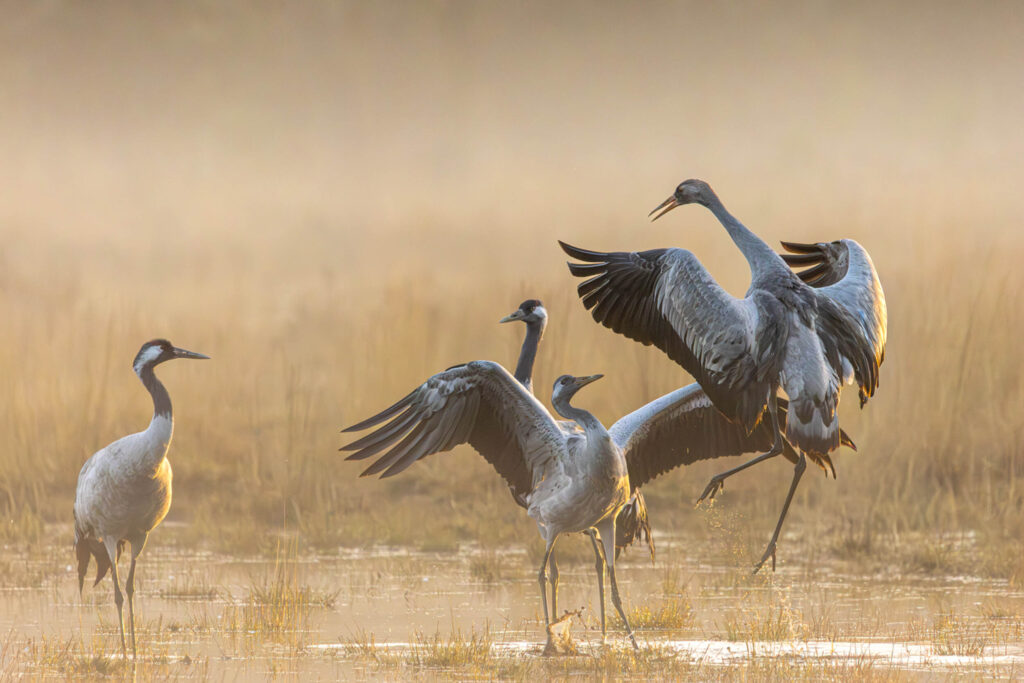 photo d'une famille de grues cendrées où les 2 juvéniles mène la bataille pour s'amuser. prise au moment où la brume est embrasée par le soleil levant. en semi contre jour.