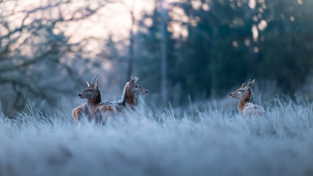 Trois daguets (jeunes cerf) photographiés dans une prairie givrée au lever du jour par -5°