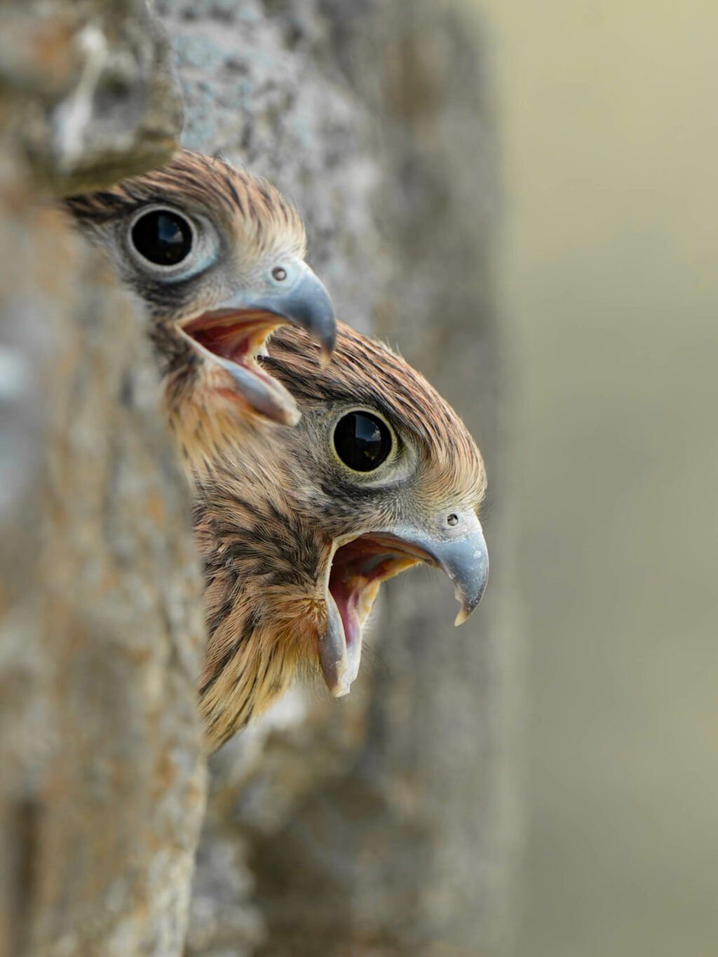 Jeunes faucons crécerelles au nid, attendant le nourrissage.