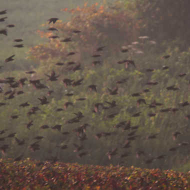 tôt un matin brumeux d'octobre, en affût au dessus des vignes j'ai voulu capter cette envol d'étourneaux volontairement flou afin de donner un rendu "peinture" à cette photo
