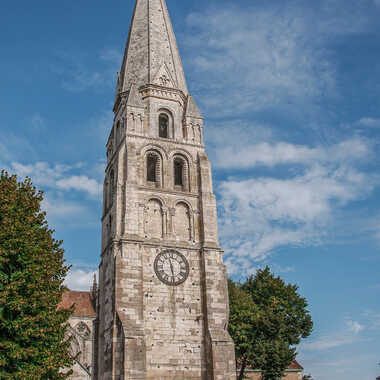 La tour, de style roman, se distingue par une base haute et massive, décorée d'une simple arcature aveugle, puis, au-dessus, par un étage servant de beffroi, ouvert de deux baies cintrées de chaque côté. Le niveau au-dessus du beffroi est occupé par un octogone, ouvert d'une seule baie à chaque face, lui-même renforcé par quatre clochetons pleins dans les angles. Le clocher se termine par une pyramide à huit pans.
