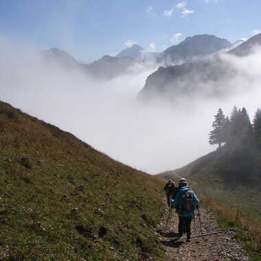 D'un coup le brouillard s’engouffre entre les montagnes et monte à notre rencontre; c'est la précipitation vers la descente pour les randonneurs