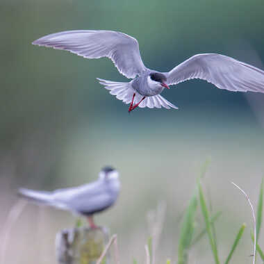 Guifettes Moustac volant au dessus d'une roselière bordant un étang de brenne.