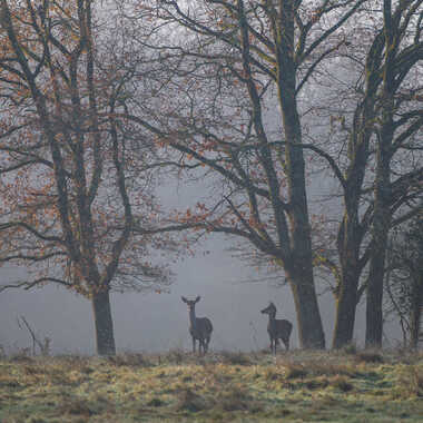 Biche et son faon photographiés au lever du jour au bord d'une clairière Solognote