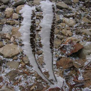 Deux brins de plantain se dressent courageusement sur le chemin givré