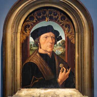 Attribué à Jacob Cornelisz Van Oostsanen (Oostzaan [Pays-Bas], 1470 – Amsterdam, 1553) ou à son fils, Dirck Jacobsz (Amsterdam, 1497-1567). Portrait de Jan Gerritsz van Egmond tenant une sculpture en buis. Verse 1520-1530. Huile sur bois.