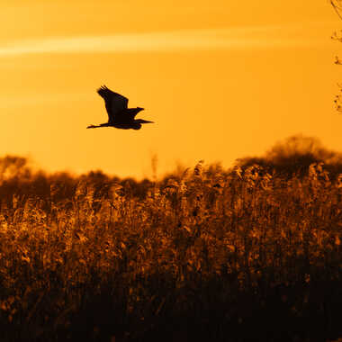 Au soleil couchant le héron cendré apparait en ombre chinoise contrastant avec une magnifique lumière.