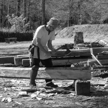 un des métiers représentés sur le site de Guedelon: le charpentier taille des poutres droites
