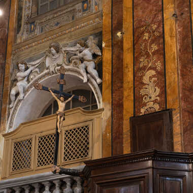 La Chaire munie d’un Crucifix tenu à bout de bras pour signifier que la mission du prédicateur consiste à annoncer Jésus-Christ, crucifié pour nos péchés.