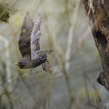 Etourneau sansonnet qui s'en va chercher des branches pour la construction de son nid... (avec extender 1,4)