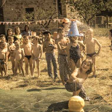 Festivités et animations . Ici un cône se maintient en l'air par un jet d'eau .Le jeu consiste à interrompre le jet et du coup à être bien arrosé