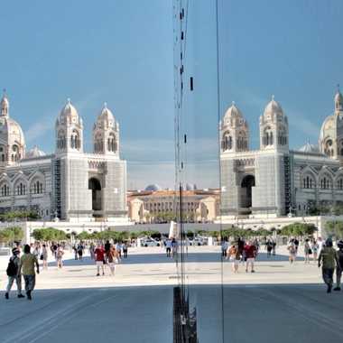 l'esplanade du J4 avec la basilique La Major et le reflet dans les vitres du MUCEM