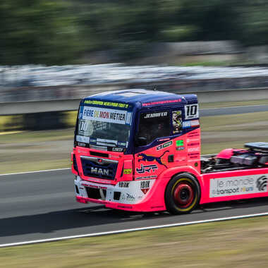 Voici le camion rose d'une passionnée de transport et de course en poids lourd. Cette pilote concoure dans les championnats. Triple championne de France 2019, 2022, 2023.