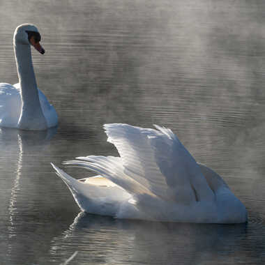 - Mots-Clés Cygne, lac, brume, plumes, reflets