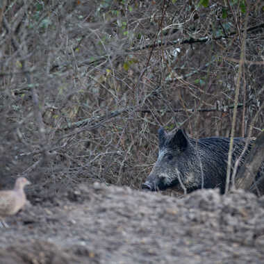 Alors que je photographiais un groupe de coqs et poules faisane sous affût au abord d'une petite clairière un sanglier s'est joint au groupe le temps de prendre une photo