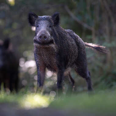 Couché dans le fossé d'une allée forestière et caché sous un filet de camouflage, une compagnie de sangliers s'approche de ma position, le vent étant face à moi ils ne m'ont pas encore senti mais commence a avoir des comportements de méfiance, cette jeune laie marque un temps d'arrêt afin d'humer l'air devant elle, quelques secondes plus tard elle passera à ma hauteur et je n'échapperais pas à son odorat, la compagnie s'enfuira au galop.