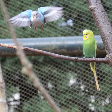 Je vous propose aujourd'hui cette prise d'un perroquet qui prend son envol tandis que son copain reste sur sa branche - Pairi Daiza 2016