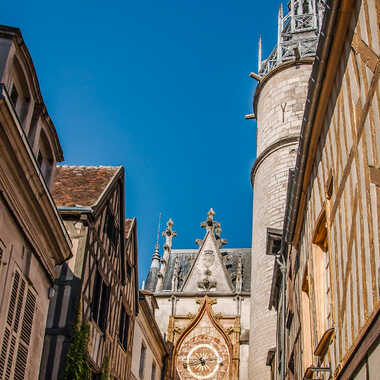 L'horloge est placée au-dessus de l'ancienne porte de Paris, dans la rue qui joint la place de l'Hôtel de ville (côté nord-est) à la rue de la Draperie (côté sud-ouest). La tour est accolée au côté sud-est de la porten 1, légèrement décalée vers l'ouest1.