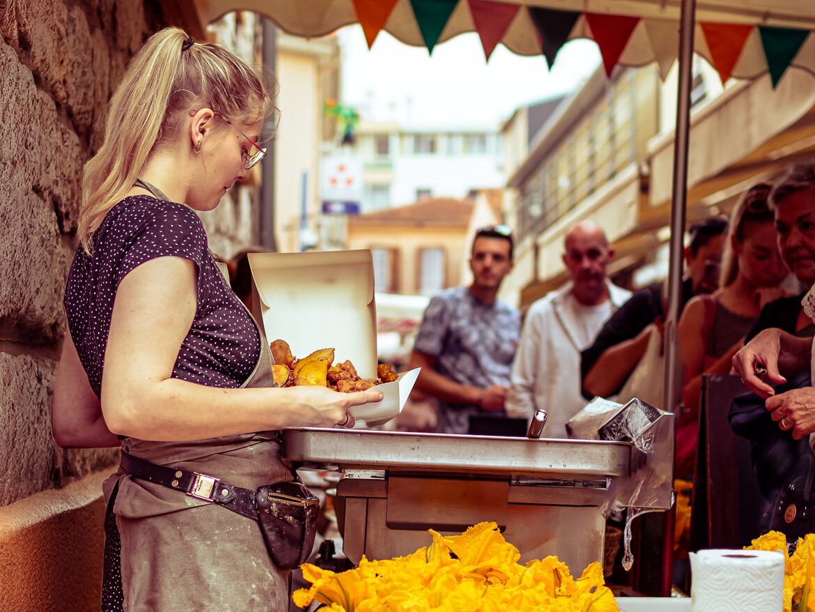 Instantané au stand de beignets de fleurs de courgettes. Ce jour-là la jeune femme paraissait quelque peu débordée, car de nombreux clients faisaient la queue alléchés par le parfum appétissant.