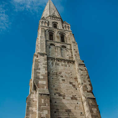 La tour, de style roman, se distingue par une base haute et massive, décorée d'une simple arcature aveugle, puis, au-dessus, par un étage servant de beffroi, ouvert de deux baies cintrées de chaque côté. Le niveau au-dessus du beffroi est occupé par un octogone, ouvert d'une seule baie à chaque face, lui-même renforcé par quatre clochetons pleins dans les angles. Le clocher se termine par une pyramide à huit pans.