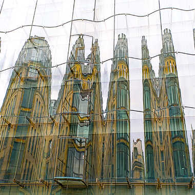 reflets d'un carrefour sur une bâche plastique transparente ondulée qui masquait un échafaudage sur une façade parisienne.