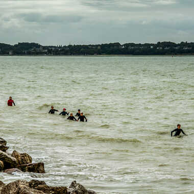 Vous regardez l’horizon, le ciel, la mer, quand soudain vous l’apercevez dans l’eau : cette grappe humaine qui chemine sur plusieurs mètres. Mais vers où ? Vêtus d’une combinaison, ses protagonistes cherchent sans doute quelque chose : un trésor, un spot de surf peut-être ?