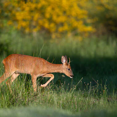 Jeune chevreuil mâle (brocard) photographié dans une clairière