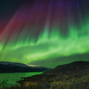En Norvège dans la région de Tromso, je savoure ce moment, un rideau d'aurores boréales de plusieurs couleurs qui en plus se reflète.