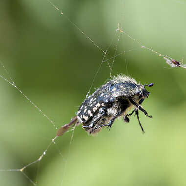 Cétoine funeste qui se débat dans une toile d'araignée.